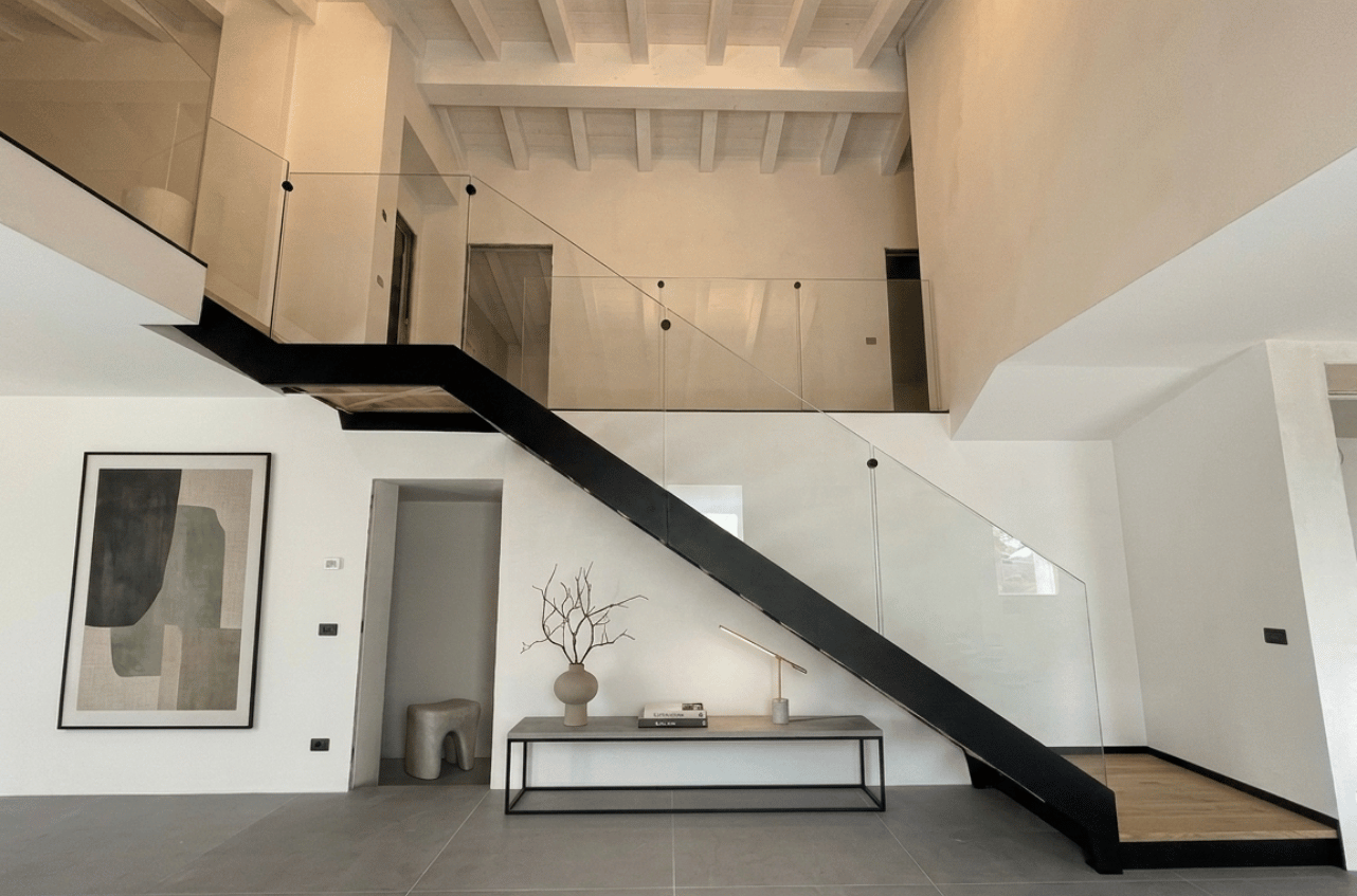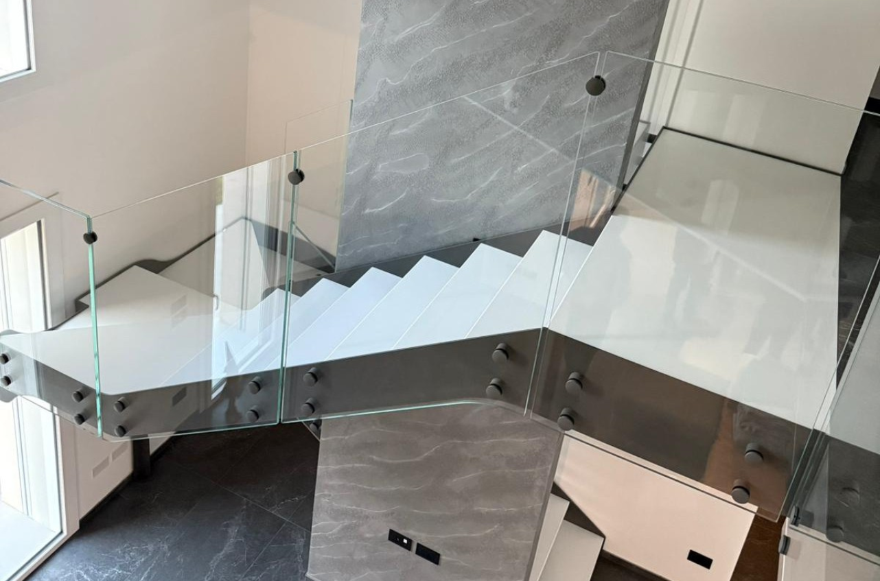 La ringhiera realizzata con pannelli in vetro stratificato extra-chiaro fissata con borchie inox a vista per dare armonia cromatica.