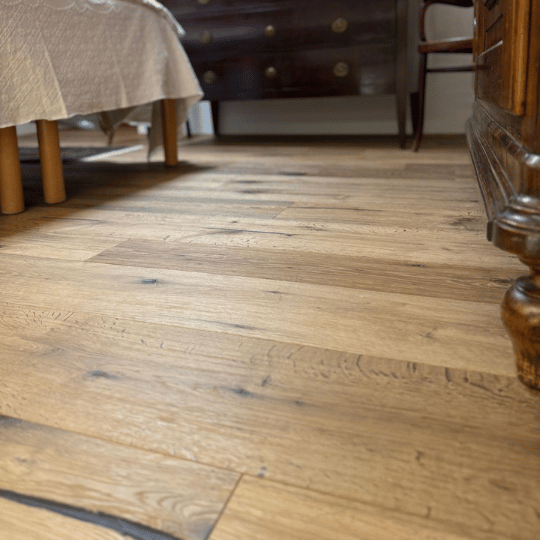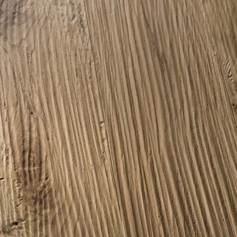 Alla lavorazione piallato a mano si aggiunge la stondatura manuale che dona al pavimento un piacevole effetto onda