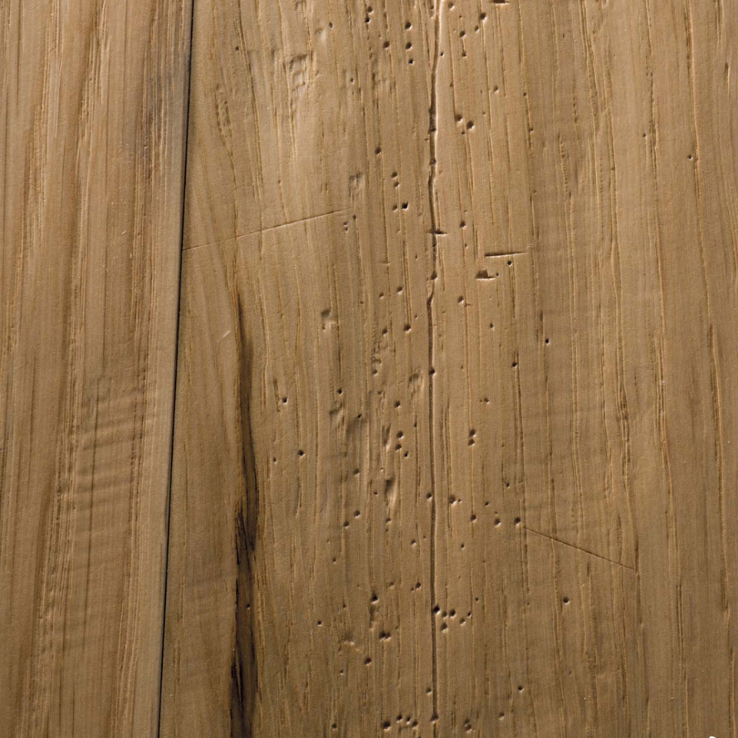Una struttura del legno imperfetta, le crepe e i nodi possono superare i 40mm. Sono percepite differenze cromatiche simbolo delle caratteristiche naturali e spontanee del legno.